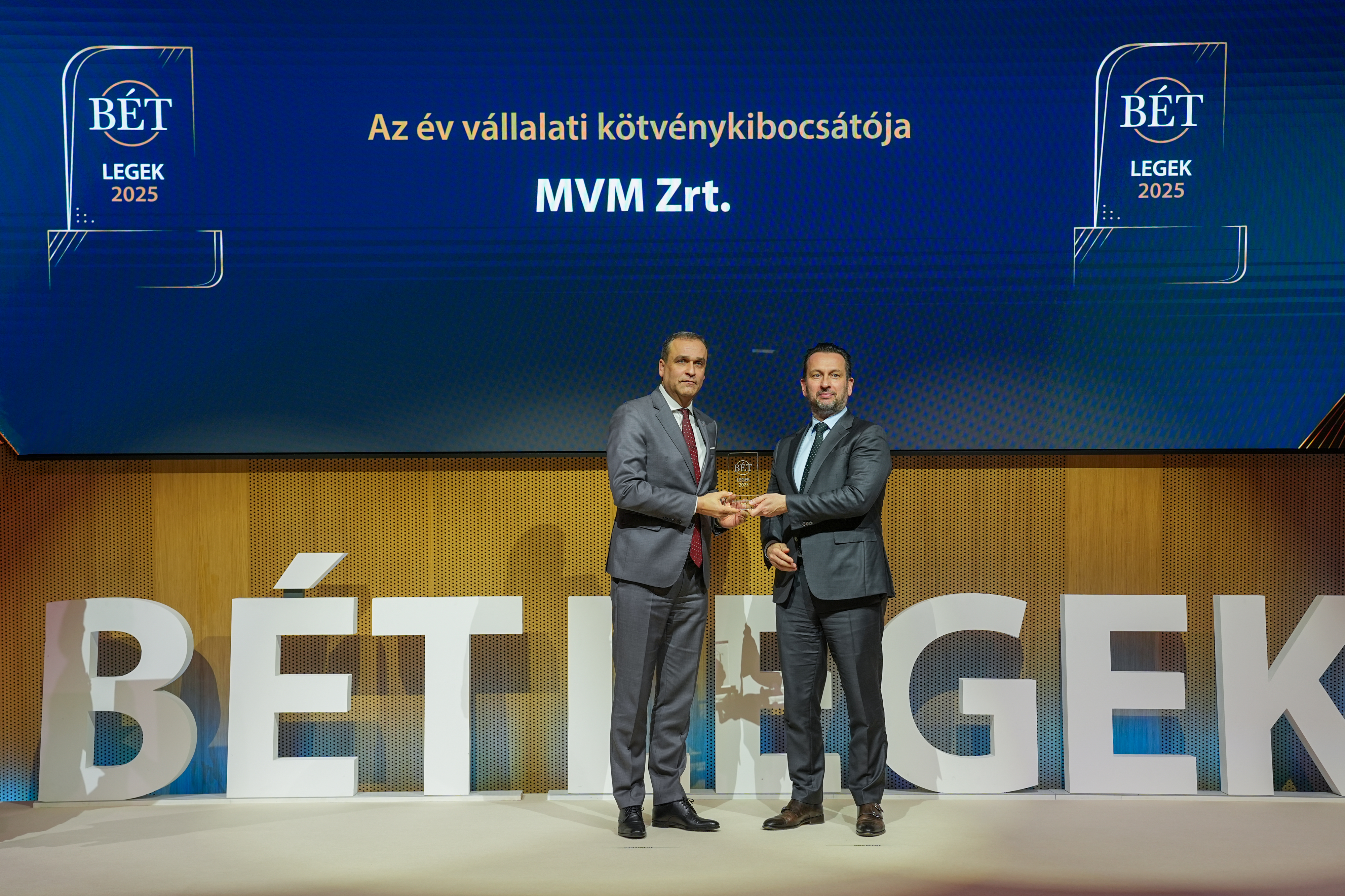 A hagyományoknak megfelelően a Budapesti Értéktőzsde 2026. február 26-án rendezte meg éves díjátadó gálaestjét, amelyen a hazai tőkepiac kiemelkedő teljesítményt nyújtó szereplőit részesítette elismerésben. A BÉT Legek díjat „Az év vállalati kötvénykibocsátója” kategóriában az MVM Zrt. nyerte el, amely újabb rangos szakmai visszaigazolása a társaság 2025-ben elindított hazai kötvényprogramjának.